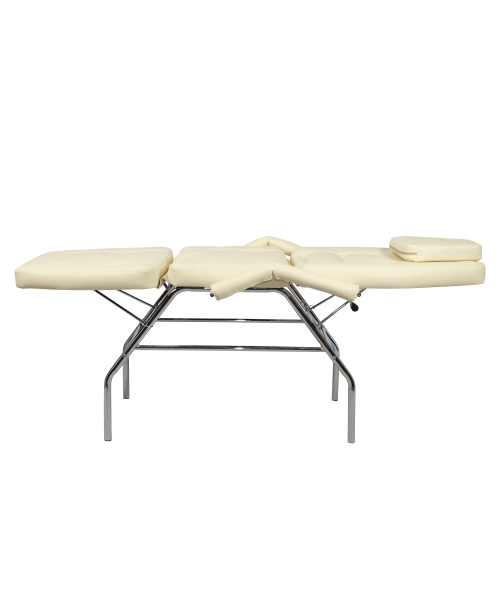Каркас изготовлен из хромированного металла и рассчитан на нагрузку до 120 кг. Эта кушетка выполнена в стандартных размерах и является удобной для клиентов практически с любым ростом.
