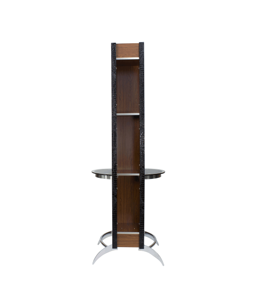 3. Передние полки: стеклянная полукруглая полочка на основании черного цвета, основание с окантовкой из полированной нержавеющей стали.
